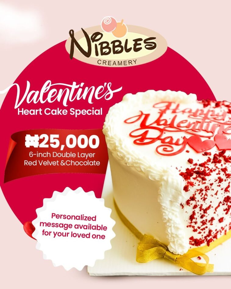 Be Intentional with Gifting: Skip the generic gifts. A personalized Nibbles Valentine’s Heart Cake (₦25,000) shows you took the time to order something specific to their taste.