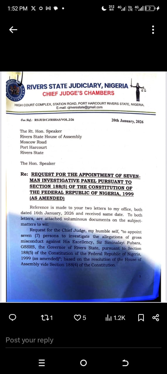 In a letter dated January 20, 2026, and addressed to the Speaker of the Rivers State House of Assembly, Rt. Hon. ————, the Chief Judge acknowledged receipt of two separate letters from the Assembly, both dated January 16, 2026, requesting the constitution of an investigative panel pursuant to Section 188(5) of the 1999 Constitution of the Federal Republic of Nigeria (as amended).