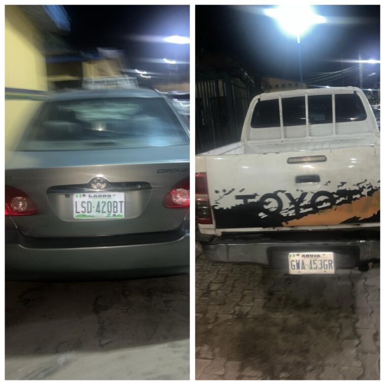 The recovered vehicles include a white Toyota Hilux with a fake registration number GWA 453 GR and an ash-colour Toyota Corolla with a fake registration number LSD 420 BT. Both vehicles are in Police custody, for discreet investigation.