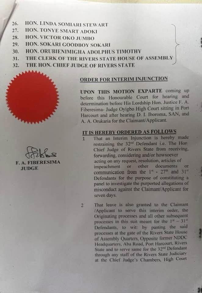A Rivers State High Court of Oyibo local government Area sitting in Port Harcourt has issued an interim order of injunction against the Speaker of Rivers State House of Assembly, MARTIN CHIKE-AMAEWHULE, and thirty two others including the clerk of the house and Chief Judge of Rivers State.