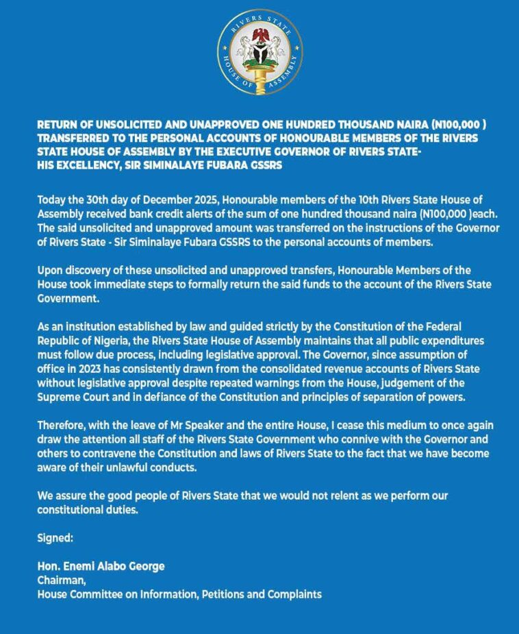 in News, Politics RSHA Lawmakers Rejects Gov. Fubara’s Largesse, Refund 100k Christmas Bonus, Give Reasons by Ogona Anita December 30, 2025, 8:26 pm 189 Views *PRESS RELEASE FROM THE RIVERS STATE HOUSE OF ASSEMBLY * See more Previous article Anambra Man Who Returned From China To Celebrate Christmas Burnt To De@th In Lagos Next article Lagos Officials Arrest Teen Begger Soliciting For Alms Using POS, Account number Written by Ogona Anita