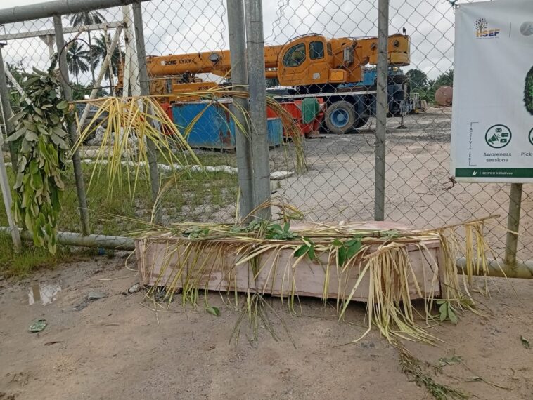 Hundreds of natives of RumuIshi-Ovu family in Rumuewhor Community, Odegu clan, Emohua Local Government Area of Rivers on Wednesday 12th November,2025 protested over alleged illegal acquisition of land, unfair treatment,non-implementation of Corporate Social Responsibility, CSR by Sterling Oil Exploration $ Energy Production Company Ltd and sealed the entrance of the company with palm tree fronds(leaves) and wooden casket.