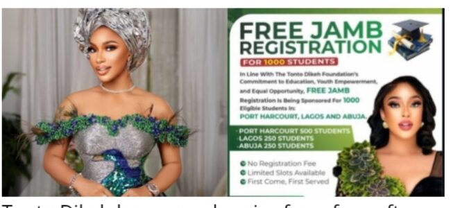 Tonto Dikeh announced she will sponsor free JAMB registration for 1,000 students through her foundation, targeting residents of Port Harcourt, Lagos, and Abuja.