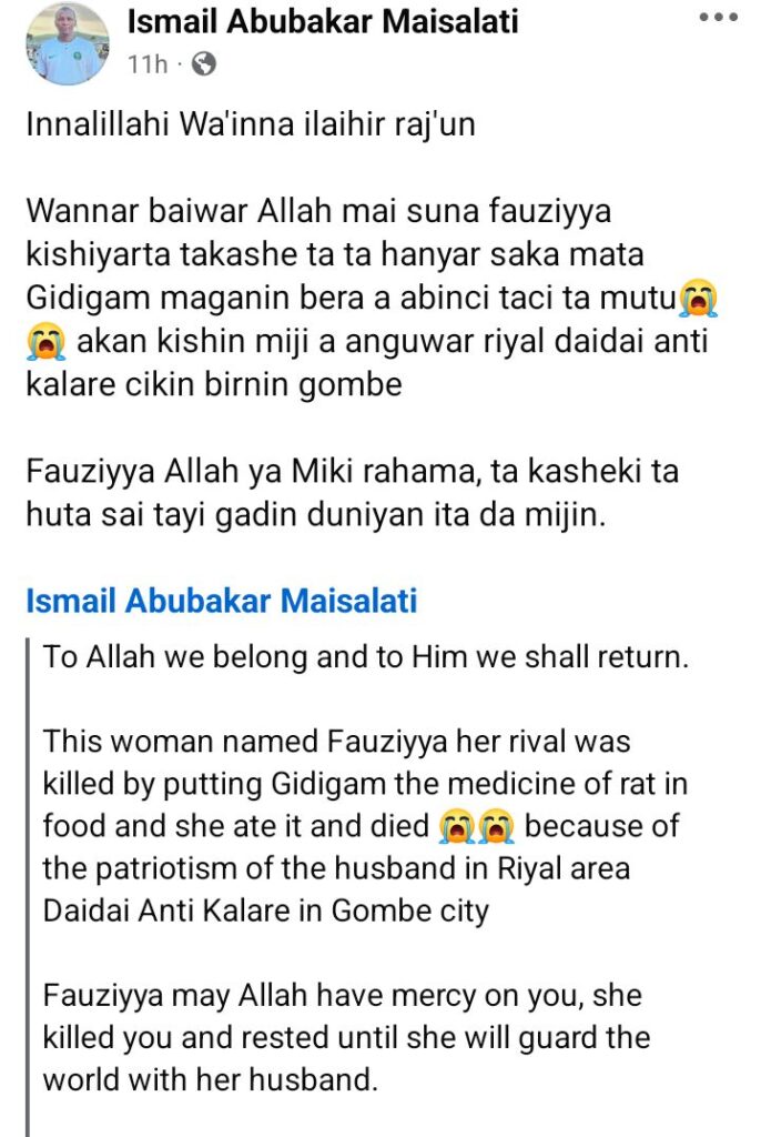 tragic incident has rocked a neighborhood in Gombe city after a woman identified as Fauziyya reportedly died from poisoning, allegedly administered by her co-wife.